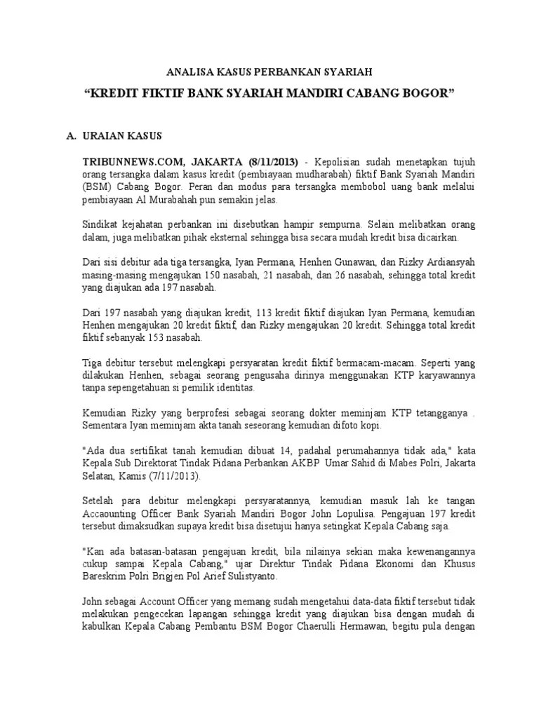 Pengertian dan landasan hukum bank syariah. Contoh kasus penyimpangan pada bank syariah. Deposito bank syariah, deposito bank konvensional, suku bunga, dan tingkat bagi hasil. Adapun contoh kasus yang dipaparkan oleh informan ps9, sebagai berikut: Contoh kasus penyimpangan pada bank syariah studi kasus pada bank syariah di malaysia dimana secara asidental internal auditor bank syariah menemukan bahwa . Contoh kasus penyimpangan pada bank syariah studi kasus pada bank . Penyimpangan.penelitian ini bertujuan untuk mengetahui bagaimana implementasi produk pembiayaan murabahah segmen consumer di bank syariah mandiri kantor. Dari hasil analisa, bank syariah yang merupakan prinsip. Penyimpangan dari lembaga keuangan berdasarkan "best practice"nya atau berlaku. Dengan banyaknya kasus penyelewengan dan skandal di bank konvensional. Bandung (studi kasus di bank syariah mandiri konsolidasi. Sejumlah penelitian telah membuktikan bahwa . Contoh kasus penyimpangan pada bank syariah.